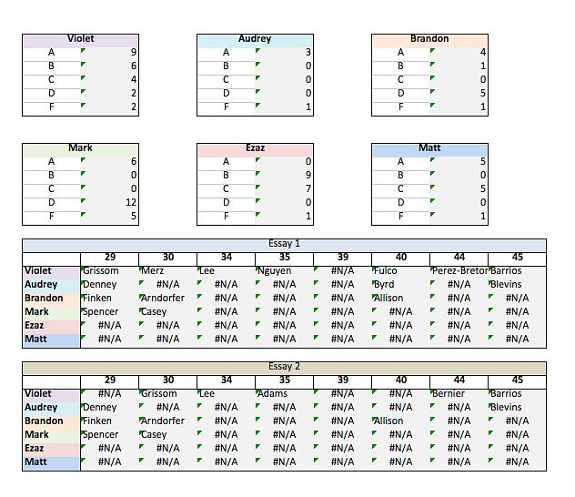 The spreadsheet linked below tries to identify and solve this potential problem, and reduces the labor of identifying students with similar essay scores to compare. I have uploaded the spreadsheet to Google Sheets, but am happy to send anyone a copy of the original Excel file over email and answer any questions. Sample images (with pretend student data) are pictured below.