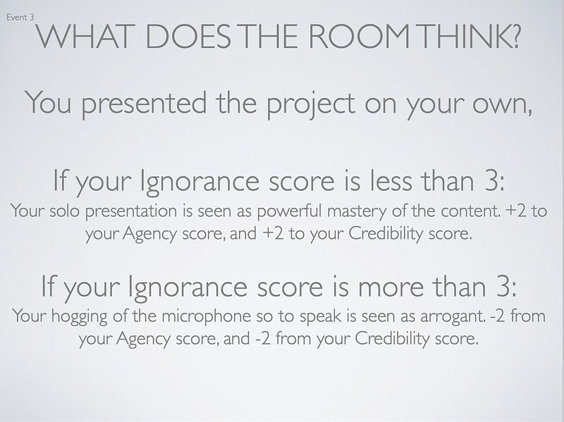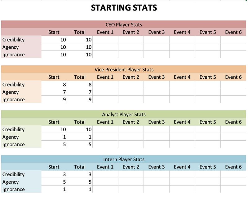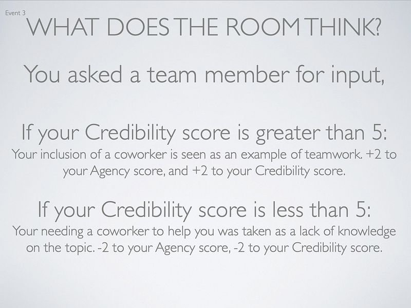 Players assume corporate roles that reflect a hierarchy within the company. Each role is assigned starting scores for Credibility, Agency, and Ignorance, which evolve based on their actions during the meeting. The game highlights how social dynamics shape knowledge and decision-making.