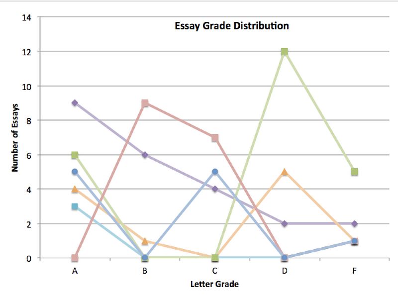 This summary graph (of fake data) shows that TA 4 is grading far more essays with a 'D' or 'F' grade relative to other TAs.