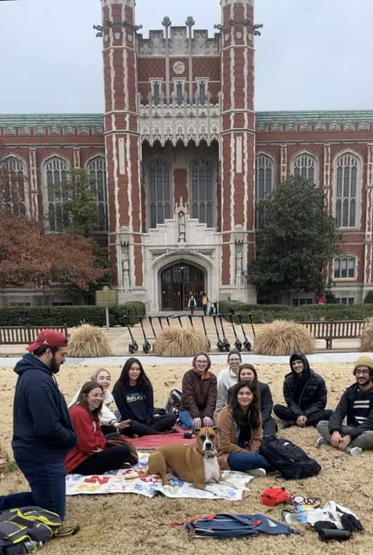 Portrait of my finals week tradition: outdoor office hours with my dog as pro-bono emotional support